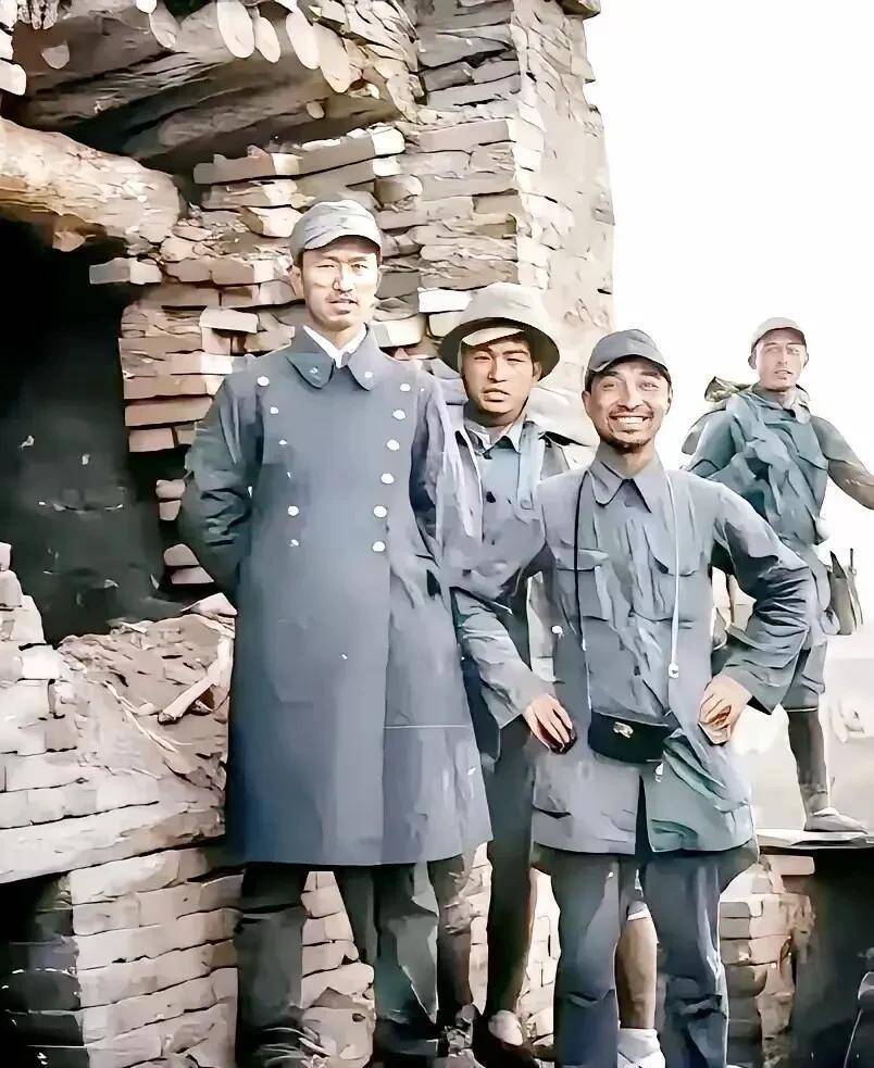 照片中周希汉将军穿着缴获的鬼子军官呢子大衣,陈赓将军则戴着日本军官的帽子,后面中间的那位是八路军386旅十六团团长谢家庆,远处的就是警卫员了。